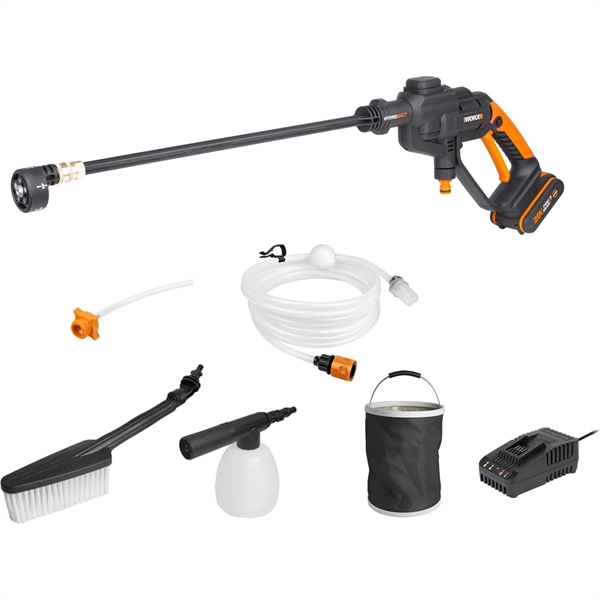 | - Standart Ekipman: 1 Adet WORX 20Volt 2.0Ah. Akü, 1 Saatlik Akü Şarj Cihazı, 6m Su Hortumu, Jaklı Basınca Dayanıklı Mızrak, Nozul, Yıkama Fırçası, Köpük Atma Haznesi, Katlanabilir Kova, Şişe Bağlantı Aparatı. |