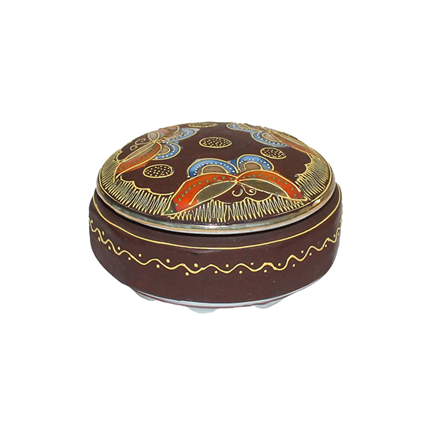 | - El boyaması kelebek ve çiçek motiflerine sahip, yuvarlak bir takı kutusudur. |