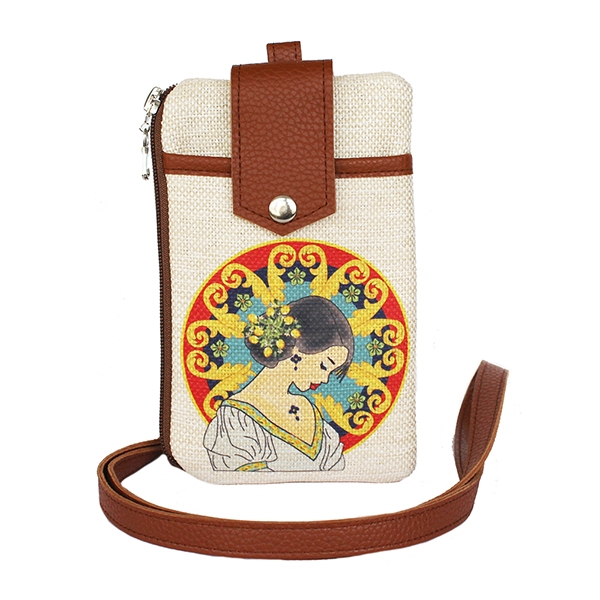FR1831 Sicilyalı Kız Baskılı, Deri Aparat, Keten Telefon Çantası