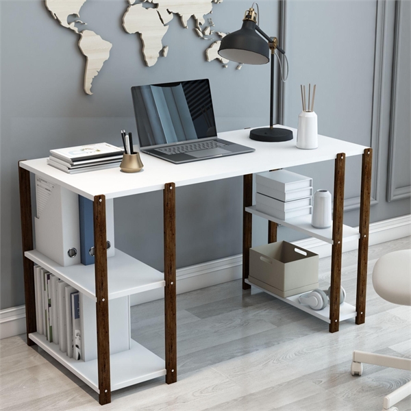 | - 4 Raflı Ahşap Kitaplıklı Çalışma, Ders, Bilgisayar Masası - Demonte, Ergonomik Tasarım ve Çift Yönlü Kullanım |
