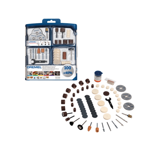 | - 100 parçadan oluşan Dremel çok amaçlı aksesuar seti hızlı ve kolay bir aksesuar değişimi sağlayan EZ SpeedClic aksesuarları da dahil olmak üzere 100 adet yüksek kaliteli orijinal Dremel aksesuar içermektedir. |