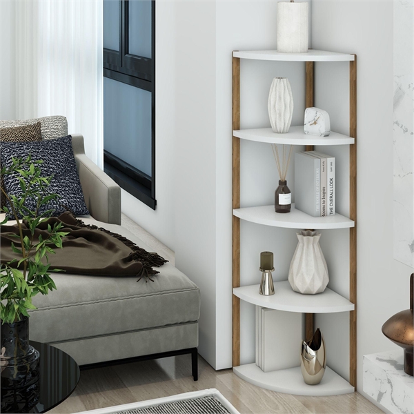 | - Jest Dekor Konsept Zümrüt 5 Raflı Üçgen Çok Amaçlı Ahşap Sehpa, hem fonksiyonel hem de estetik tasarımıyla evin her köşesinde kullanabileceğiniz çok yönlü bir üründür. Yüksekliği 109 cm, genişliği 30 cm olan bu sehpa, zarif yuvarlak rafları ve 25 cm aralıkları sayesinde çeşitli dekoratif eşyaları sergilemek için veya işlevsel kullanım seçenekleri sunuyor. |