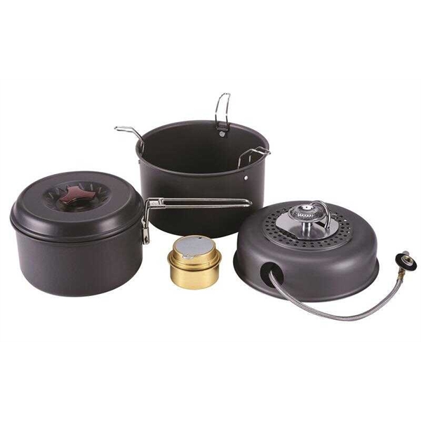 | - Benzin, ispirto, yanıcı jel ve gazla kullanılabilen portatif alüminyum tencere seti toplamda 6 parçadan oluşmaktadır. |