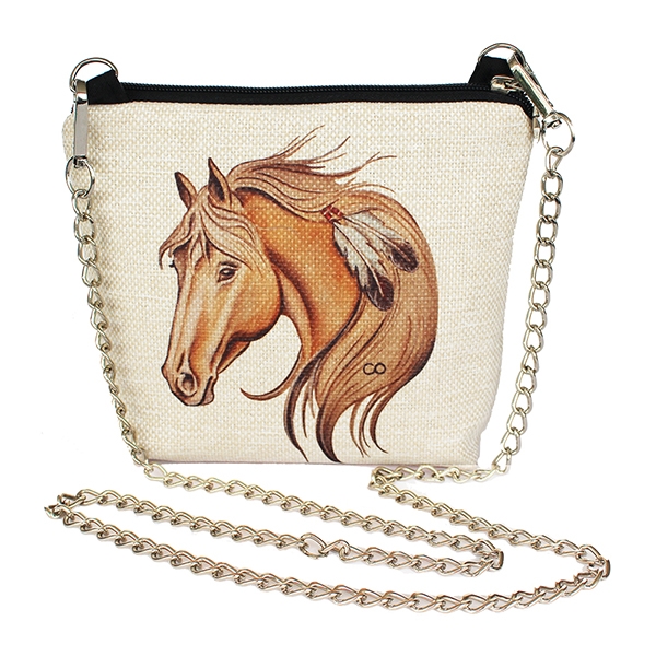 FR0435 At Baskılı Keten Kare Zincirli Çanta