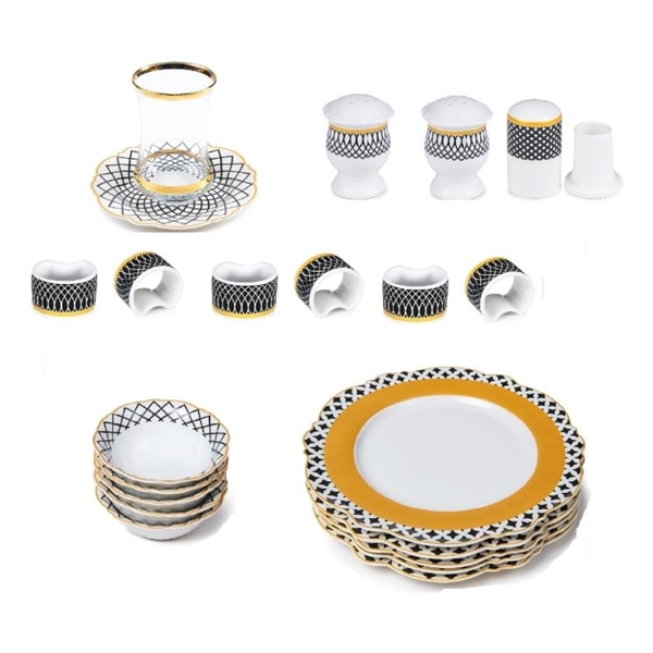 - 6 Düz servis tabağı; 6 Çay Bardağı ; 6 Çay Tabağı; 6 Kase; .6 Halka Peçetelik; 1 Tuzluk; 1 Biberlik; 1 Kapaklı Kürdanlık.