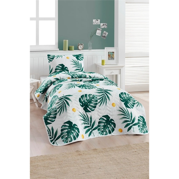 Tek Kişilik Kapitone Monstera Yeşil Yatak Örtüsü Seti