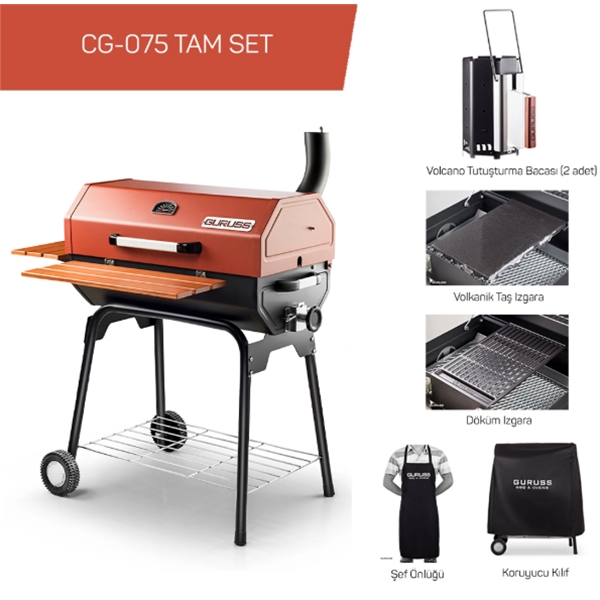 - Set içeriği: Guruss CG-075 Kömürlü Barbekü Mangal Oksit Kırmızı,3 adet Tel Izgara,1 adet Döküm Izgara (Pişirme alanının 1/3'ünü kaplar) ,1 adet Volkanik Taş Izgara ,2 adet Volcano Tutuşturma Bacası,Koruyucu Kılıf,Şef Önlüğü